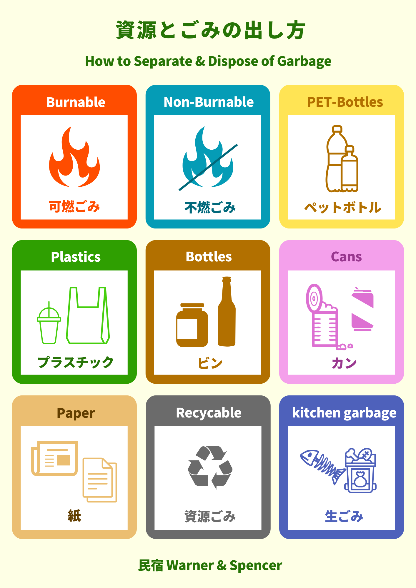 - 産業廃棄物: カン、ビン、ペットボトル、プラスチック容器など。